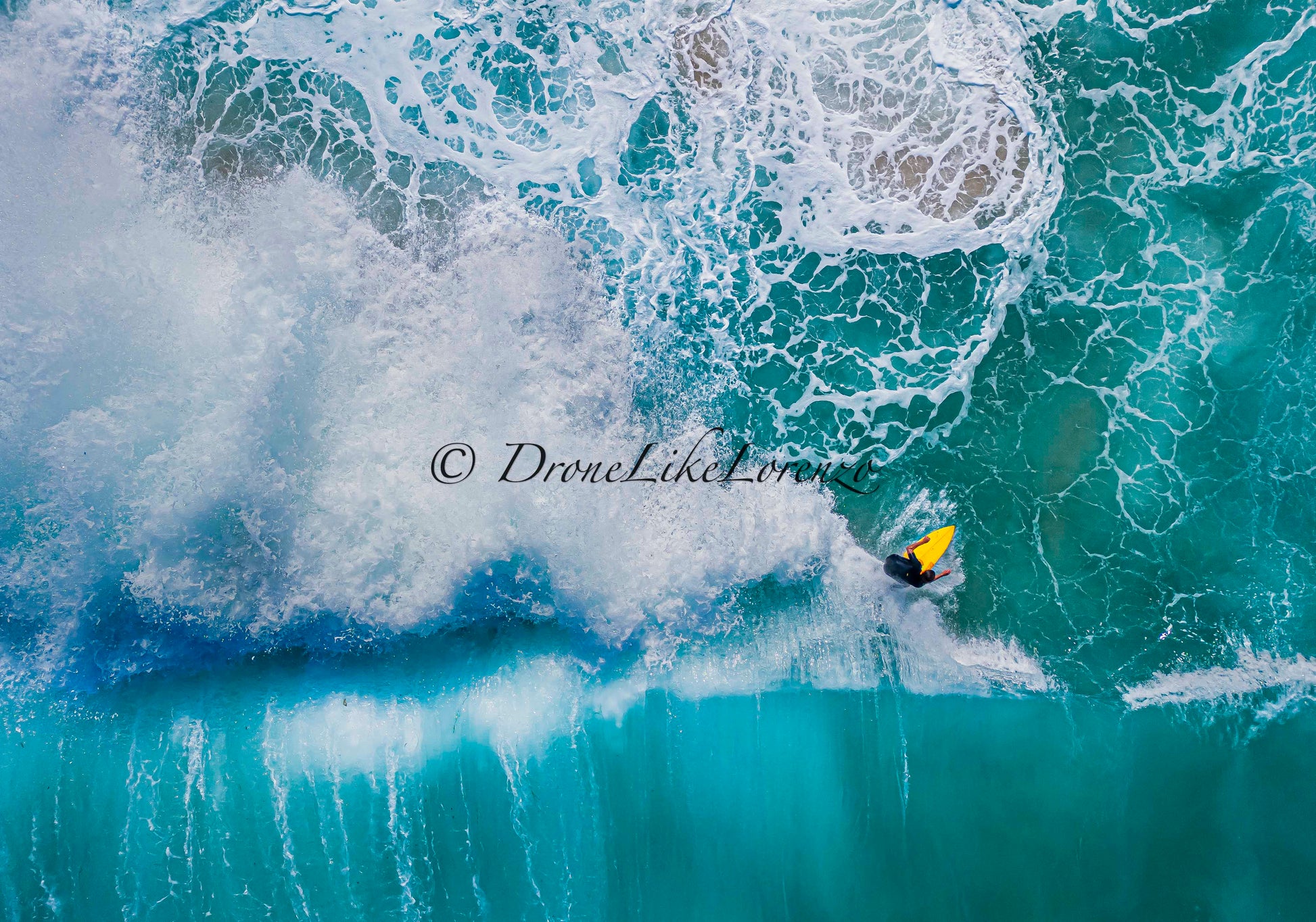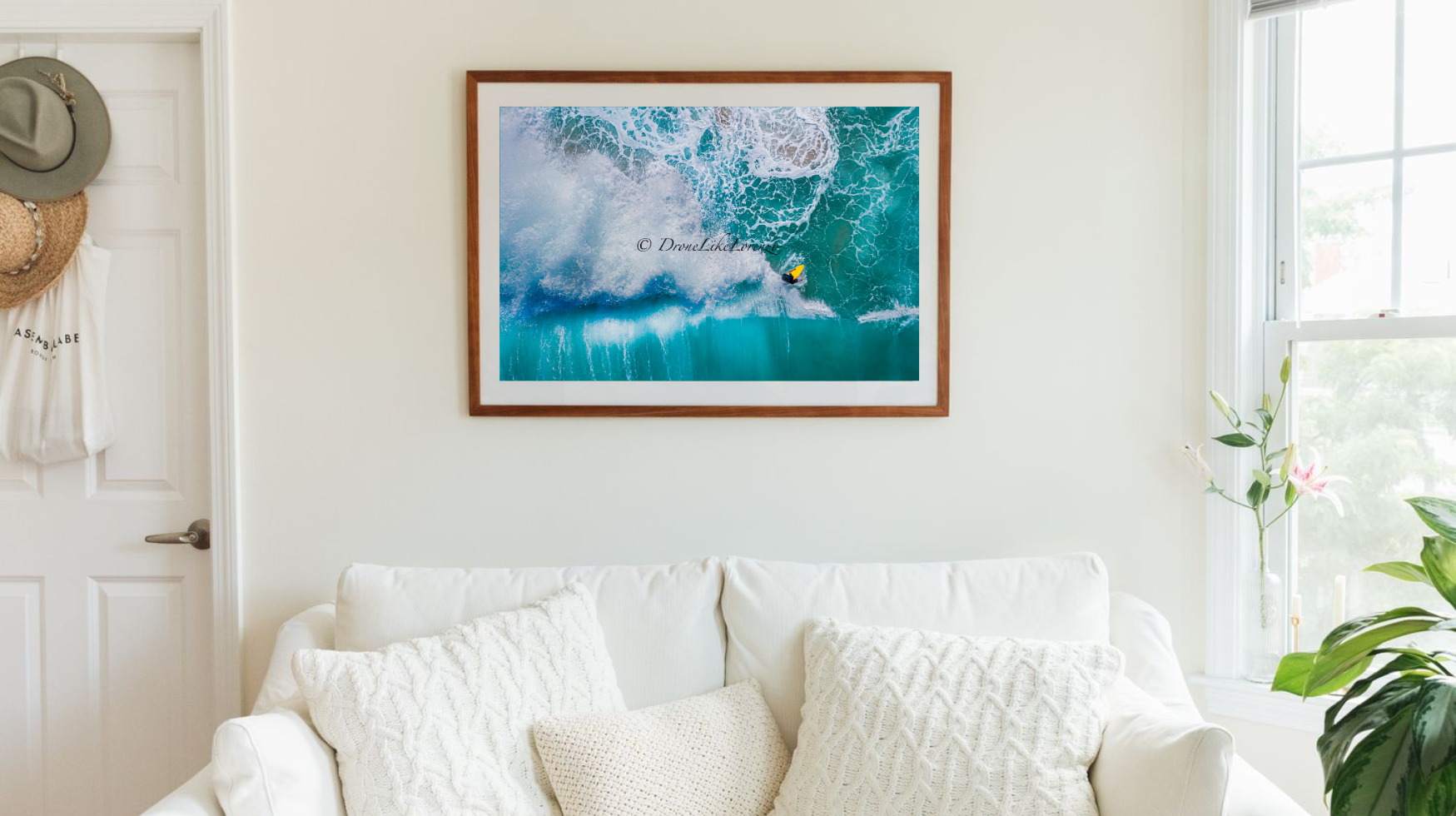 Ride the wave with 'Aquatic Cyclone', an aerial snapshot capturing the ocean's raw power and a surfer's daring feat. Inject your space with the ocean's boundless energy and vibrant hues.