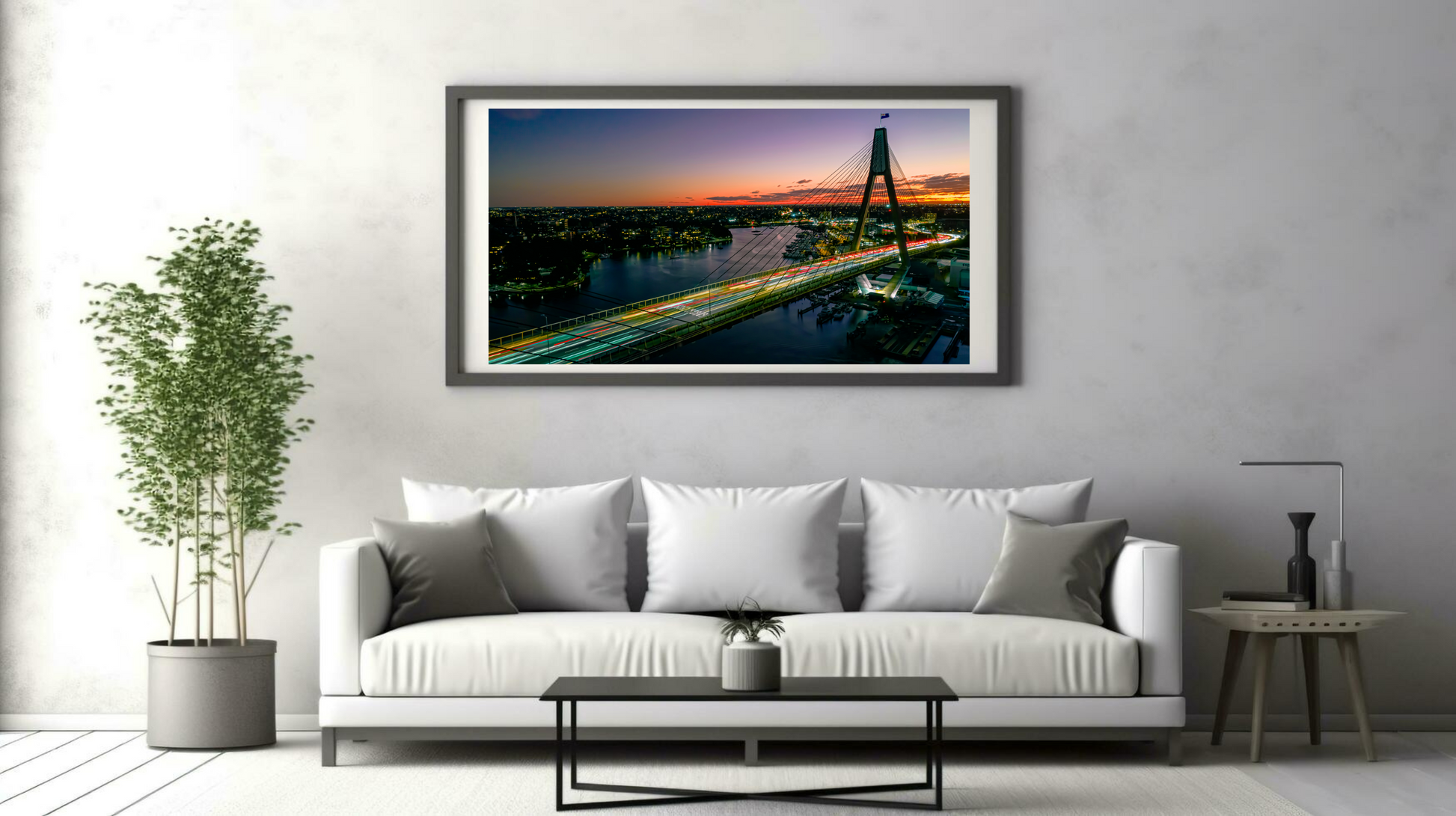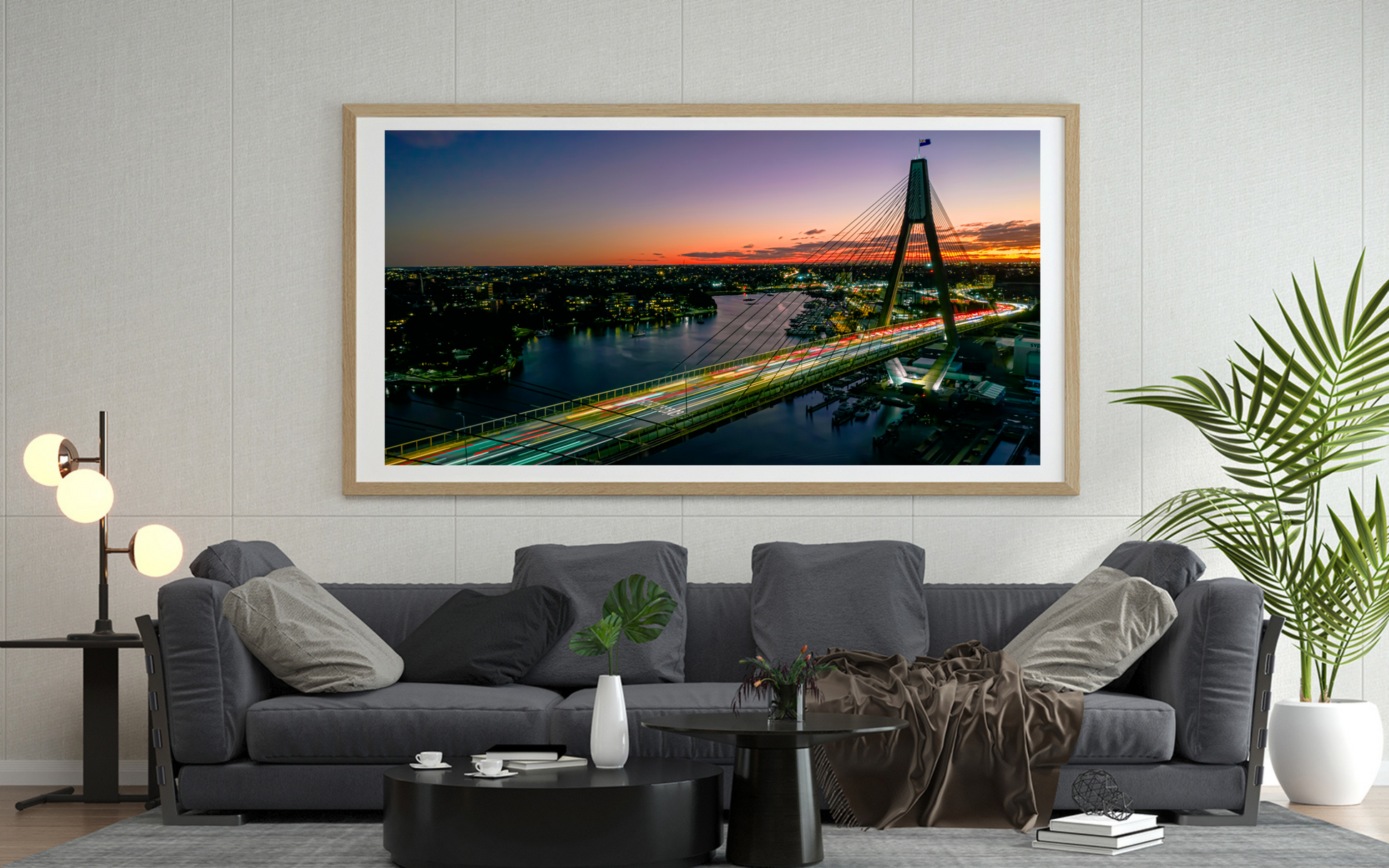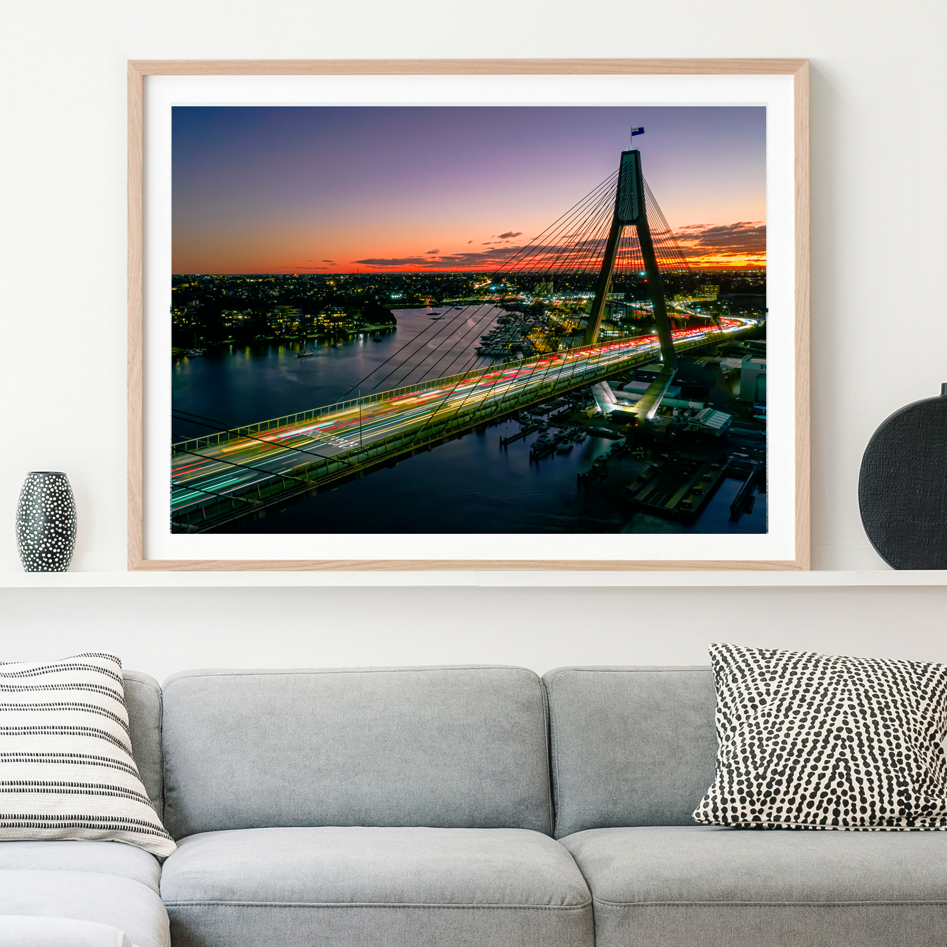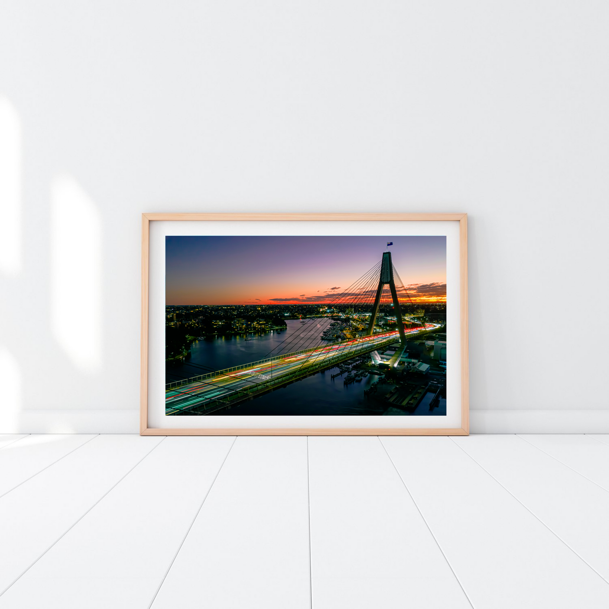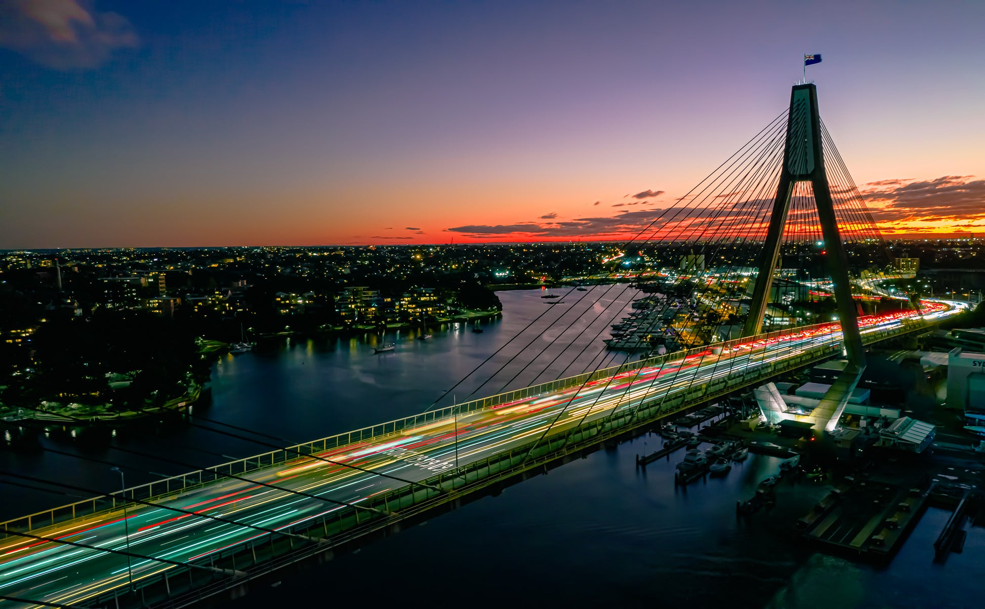 Anzac Bridge awash in the sunset’s glow, the day’s last light captured in this exquisite aerial shot. Sydney’s heartbeat in light trails, arcing into the Blue hour.