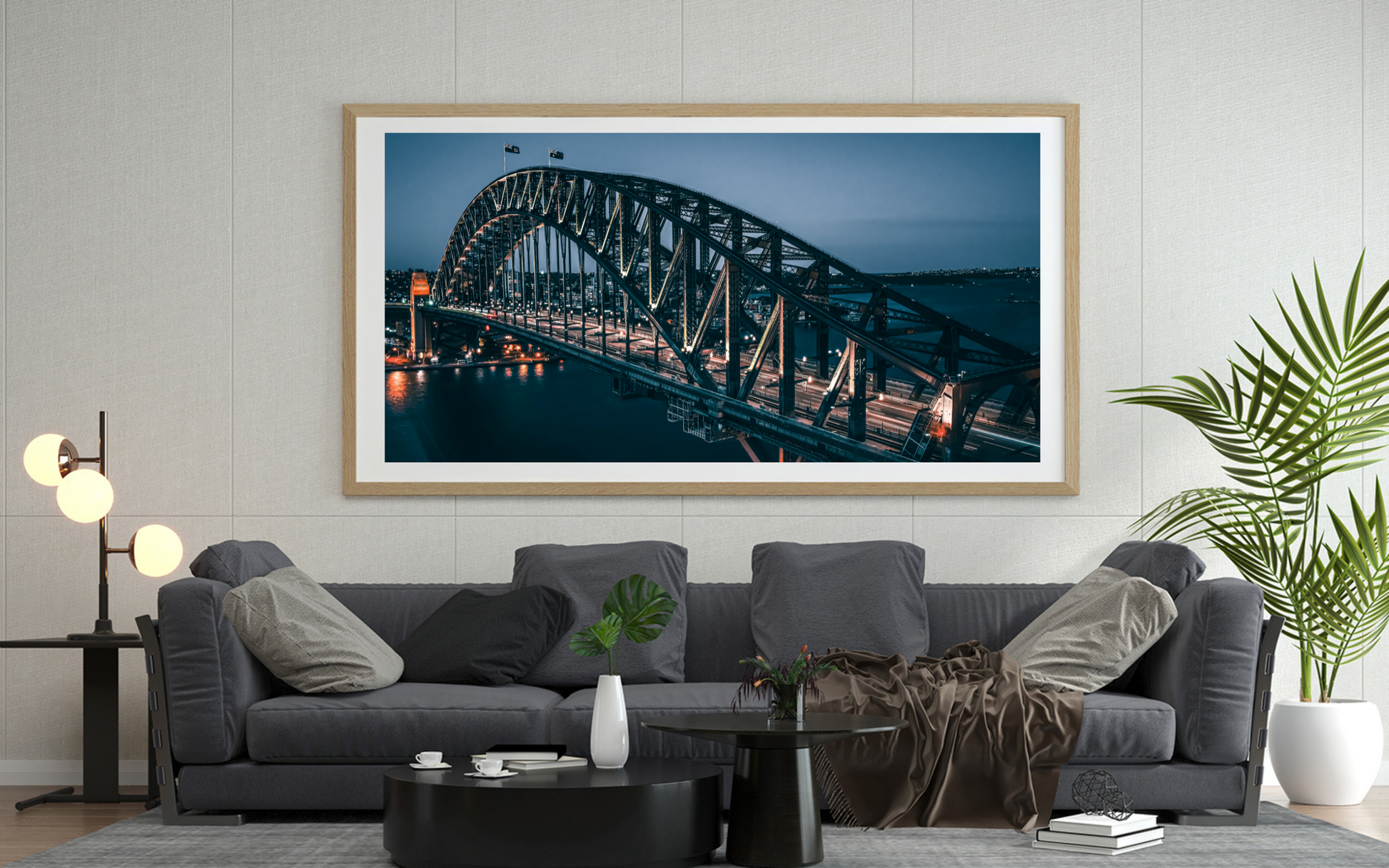 Under the metallic hues of the blue hour, the Harbour Bridge stands majestic, its structure highlighted by the brisk movement of city life. In this finely detailed long exposure shot, lights streak across the architecture, echoing the energy of Sydney. Proudly atop, the flags flutter, clear and distinguished, as sentinels to the bustling harbour below.