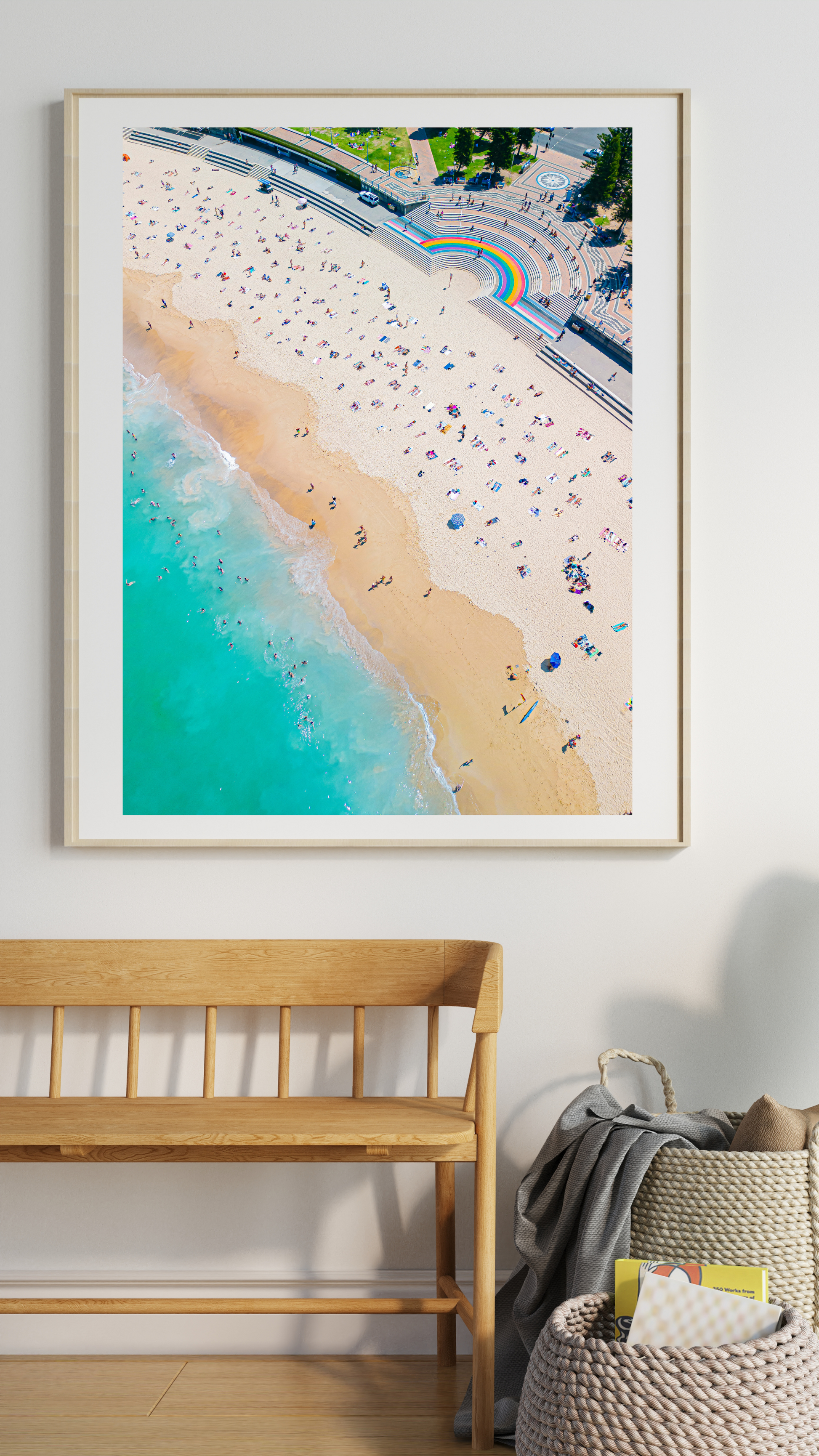 Let the tranquil hues of Coogee Beach’s turquoise waters blend with the warm tones of its sandy shores lull you into relaxation. Bring the essence of the sun and sea into your home with this aerial beach photograph.