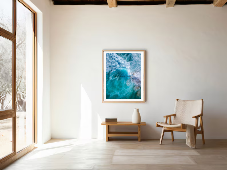 Ride the wave with 'Avalanche', an aerial snapshot capturing the ocean's raw power and a surfer's daring feat. Inject your space with the ocean's boundless energy and vibrant hues.