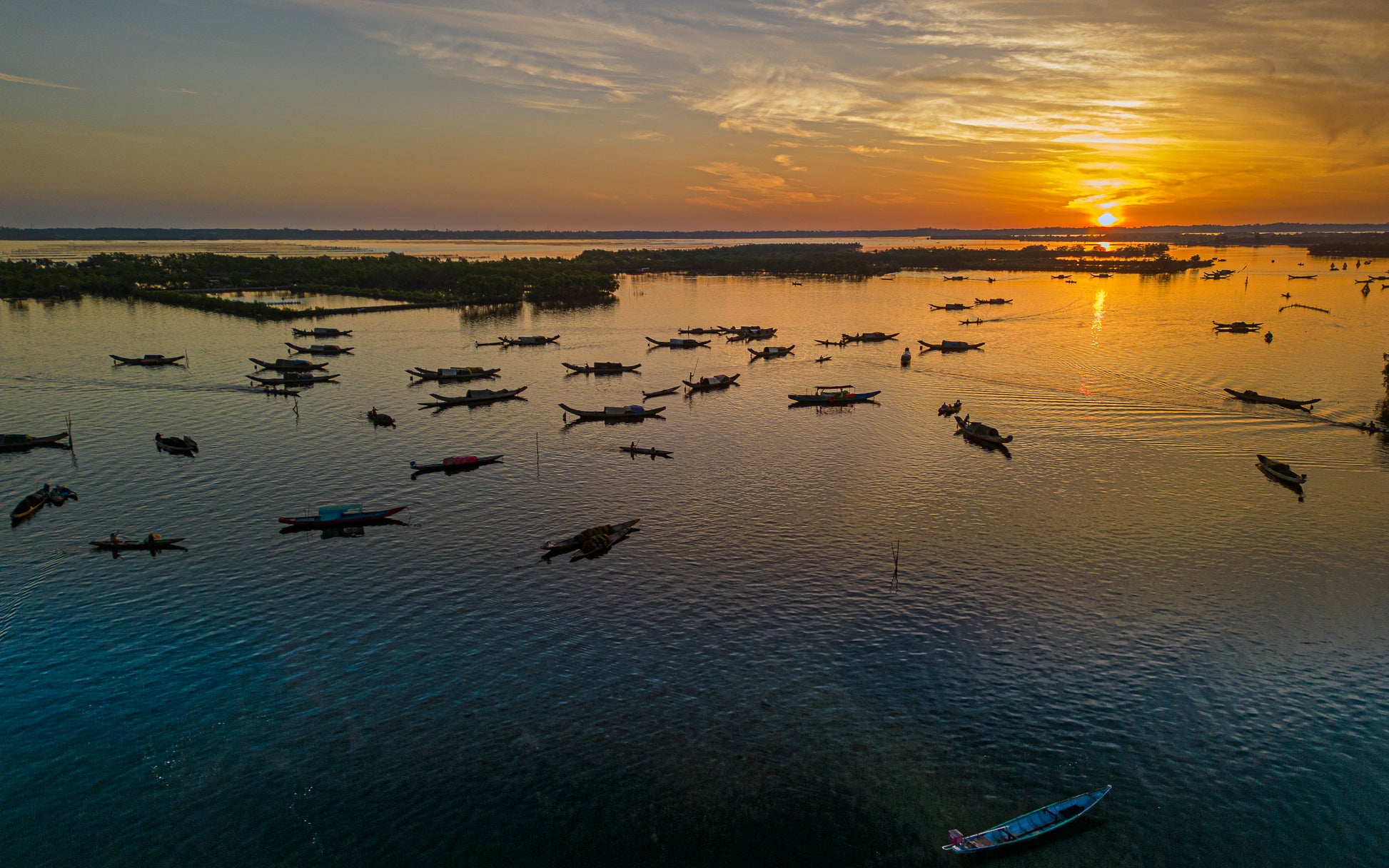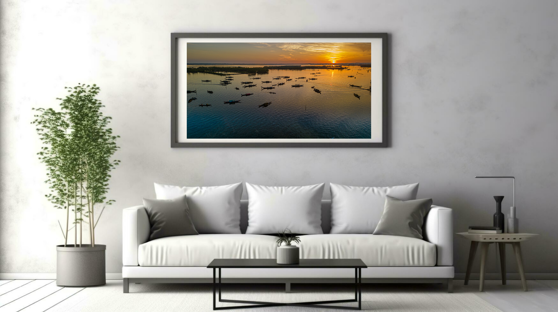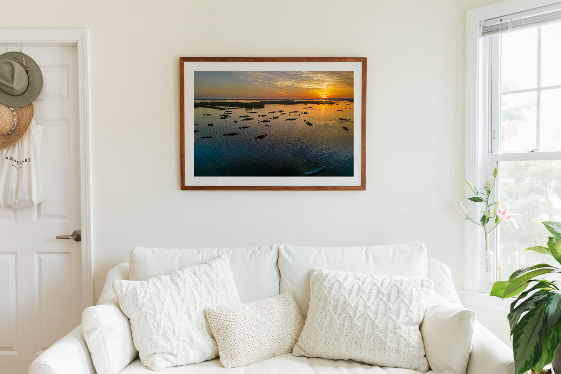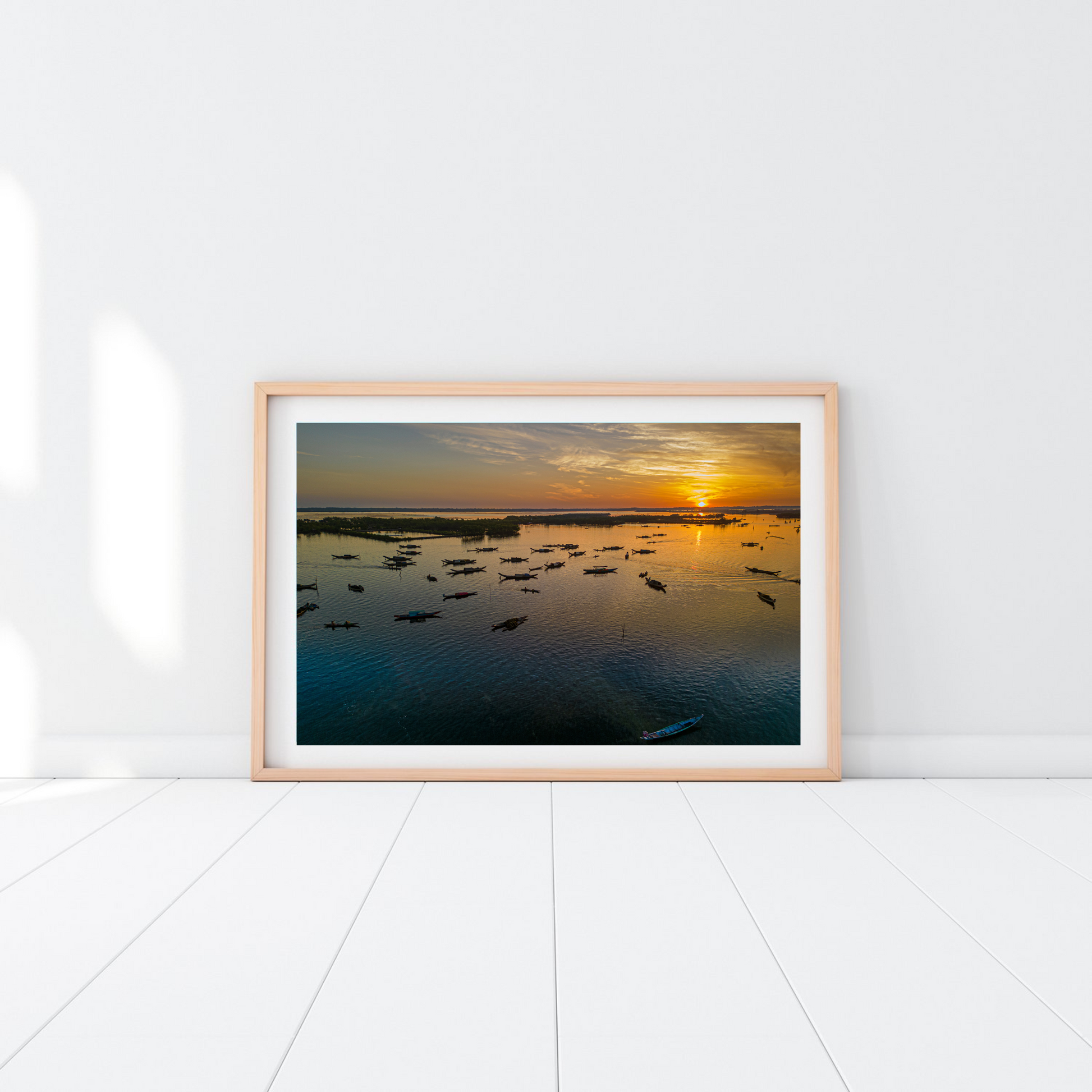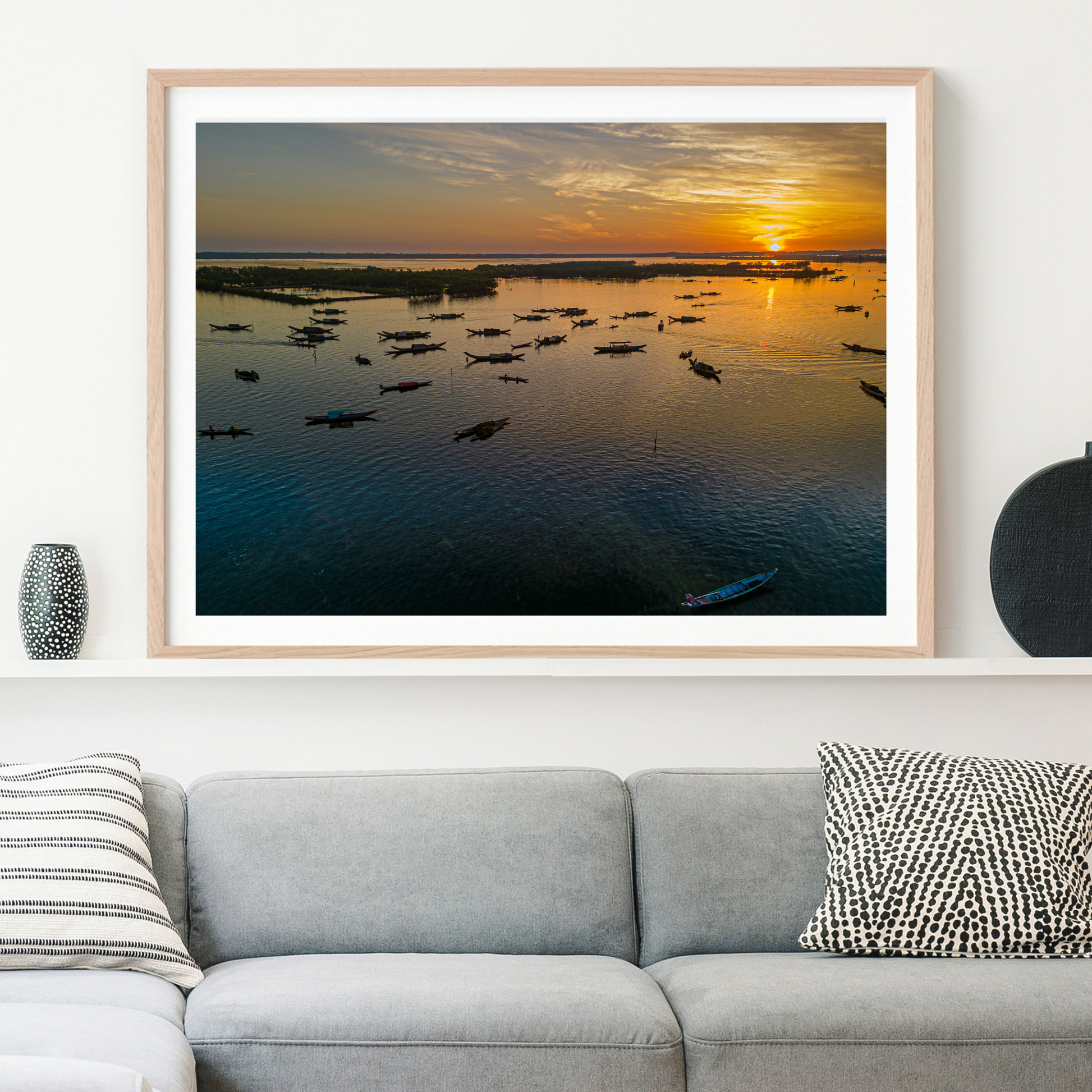 Embrace the calm of dawn with this aerial photo of a Vietnamese fishing village, where the sky's morning glow meets the diligent stirrings of daily life. The gentle amber of sunrise illuminates the water, reflecting the quiet yet vibrant awakening of the community.