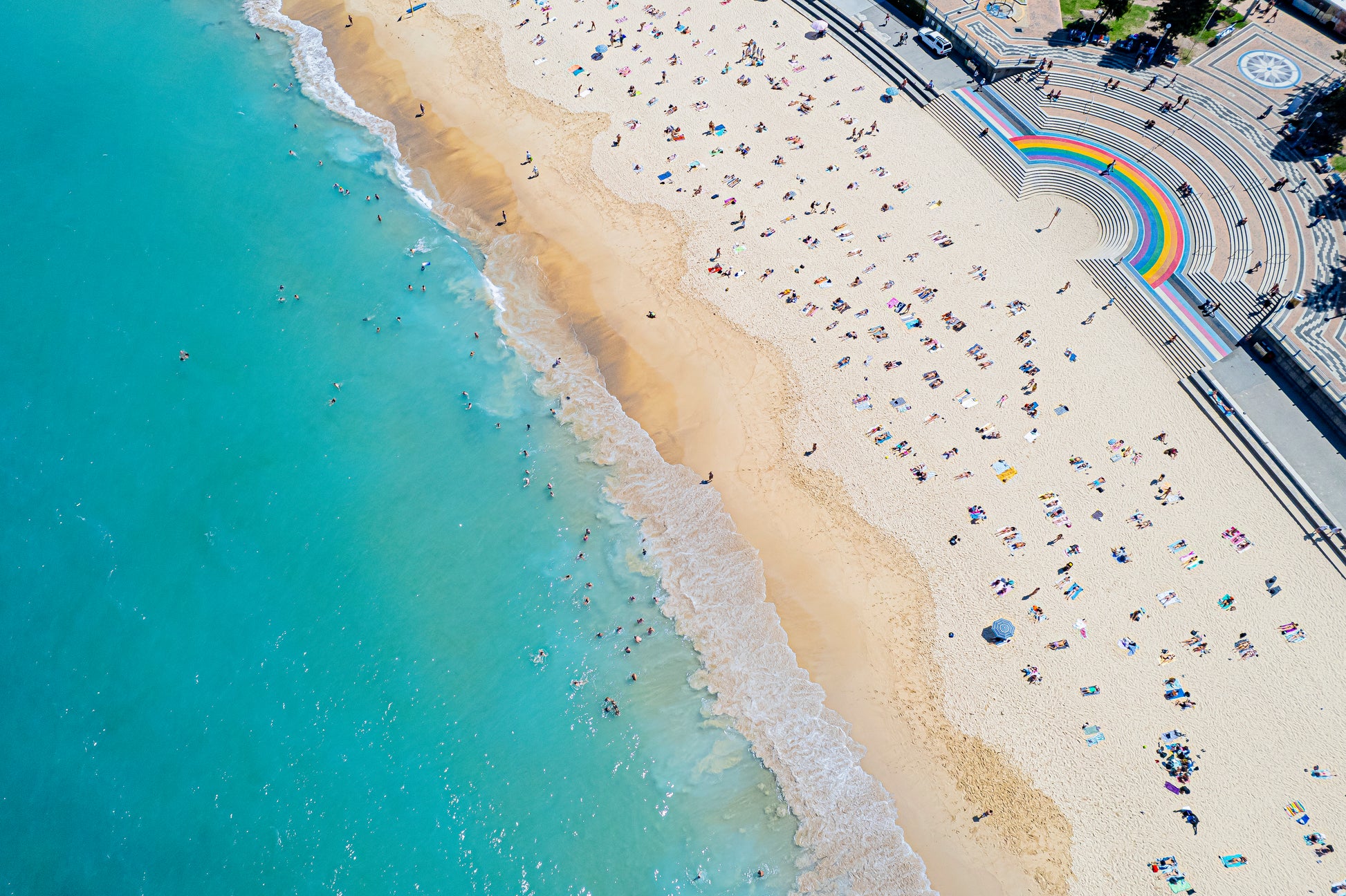 Let the tranquil hues of Coogee Beach’s turquoise waters blend with the warm tones of its sandy shores lull you into relaxation. Bring the essence of the sun and sea into your home with this aerial beach photograph.