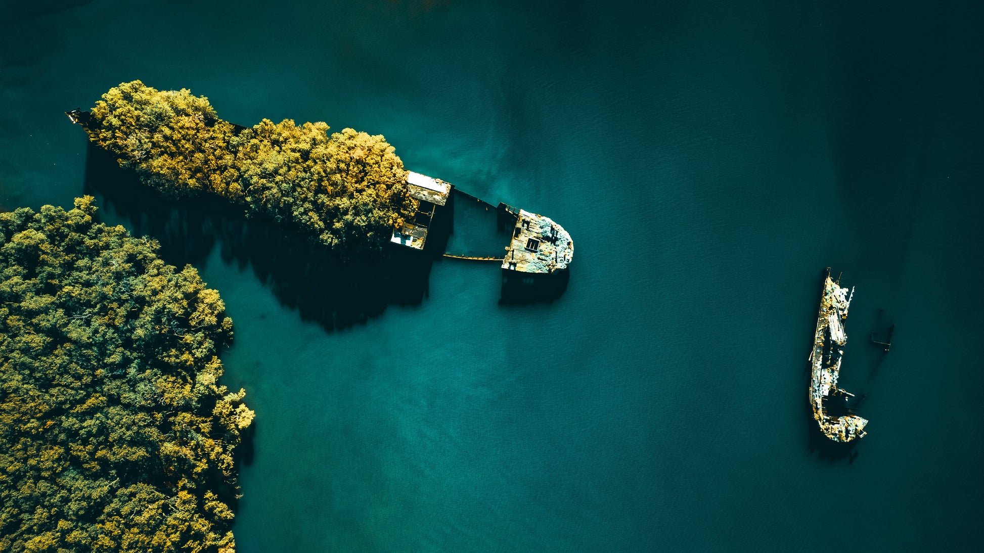 Behold 'The Floating Forest'—the SS Ayrfield's remarkable transformation into a lush mangrove ecosystem. This striking aerial photograph showcases nature’s reclaiming power as verdant foliage envelops the historic shipwreck, creating a captivating juxtaposition of past and present.