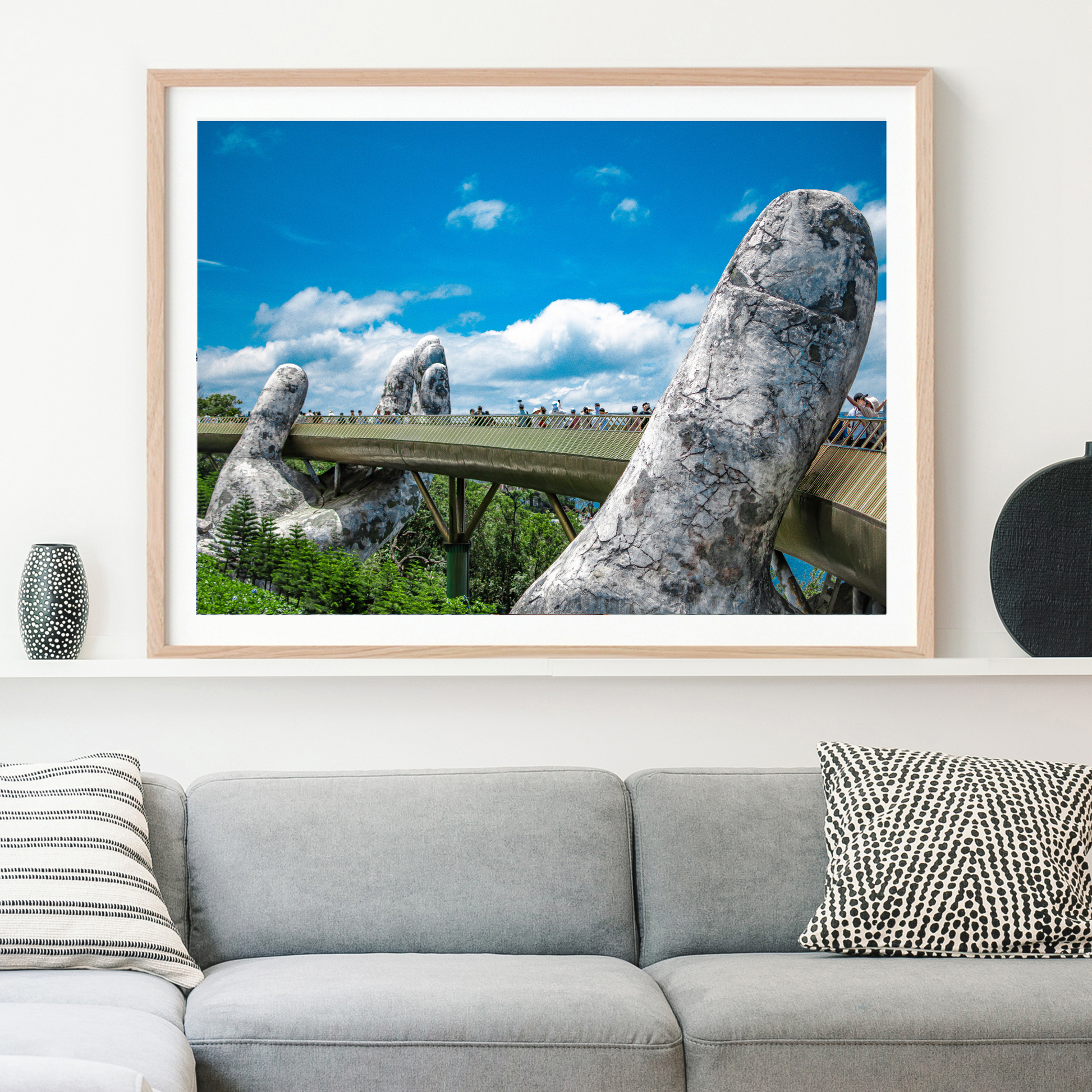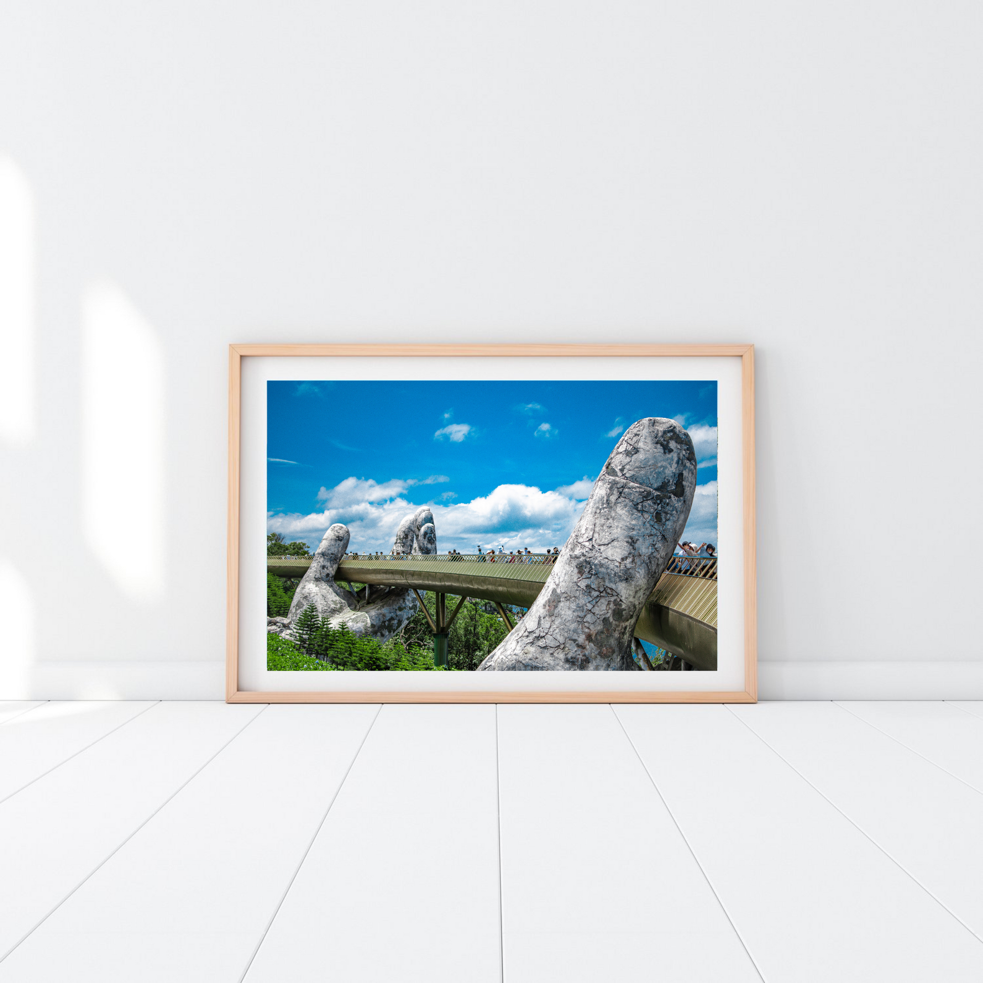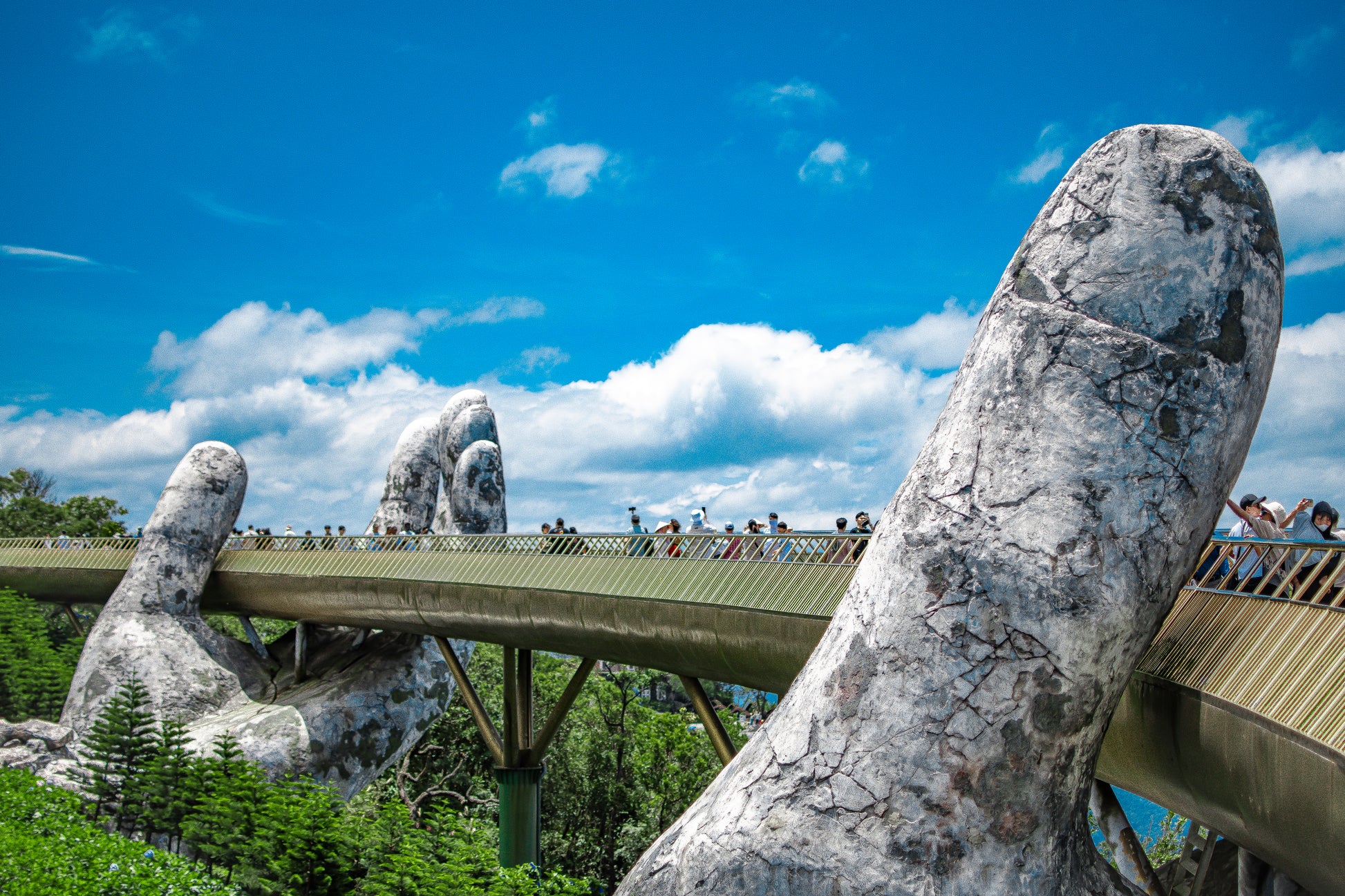 Discover the 'God's Hand', an extraordinary depiction of Vietnam's Golden Bridge, cradled by colossal stone hands. This aerial image encapsulates the ethereal beauty of human creativity blending with natural splendor.