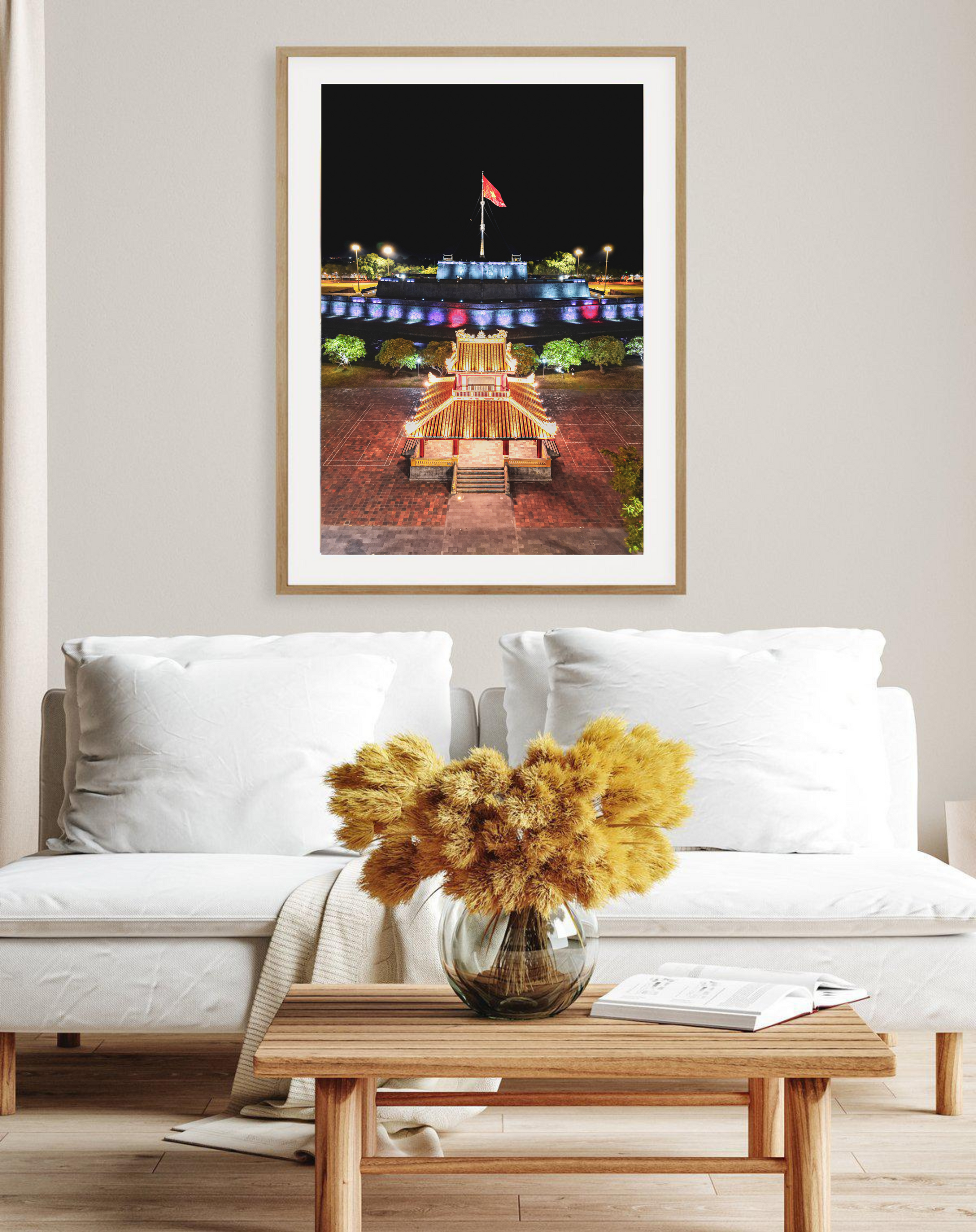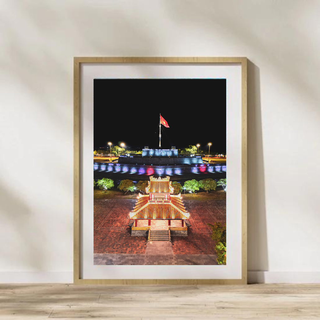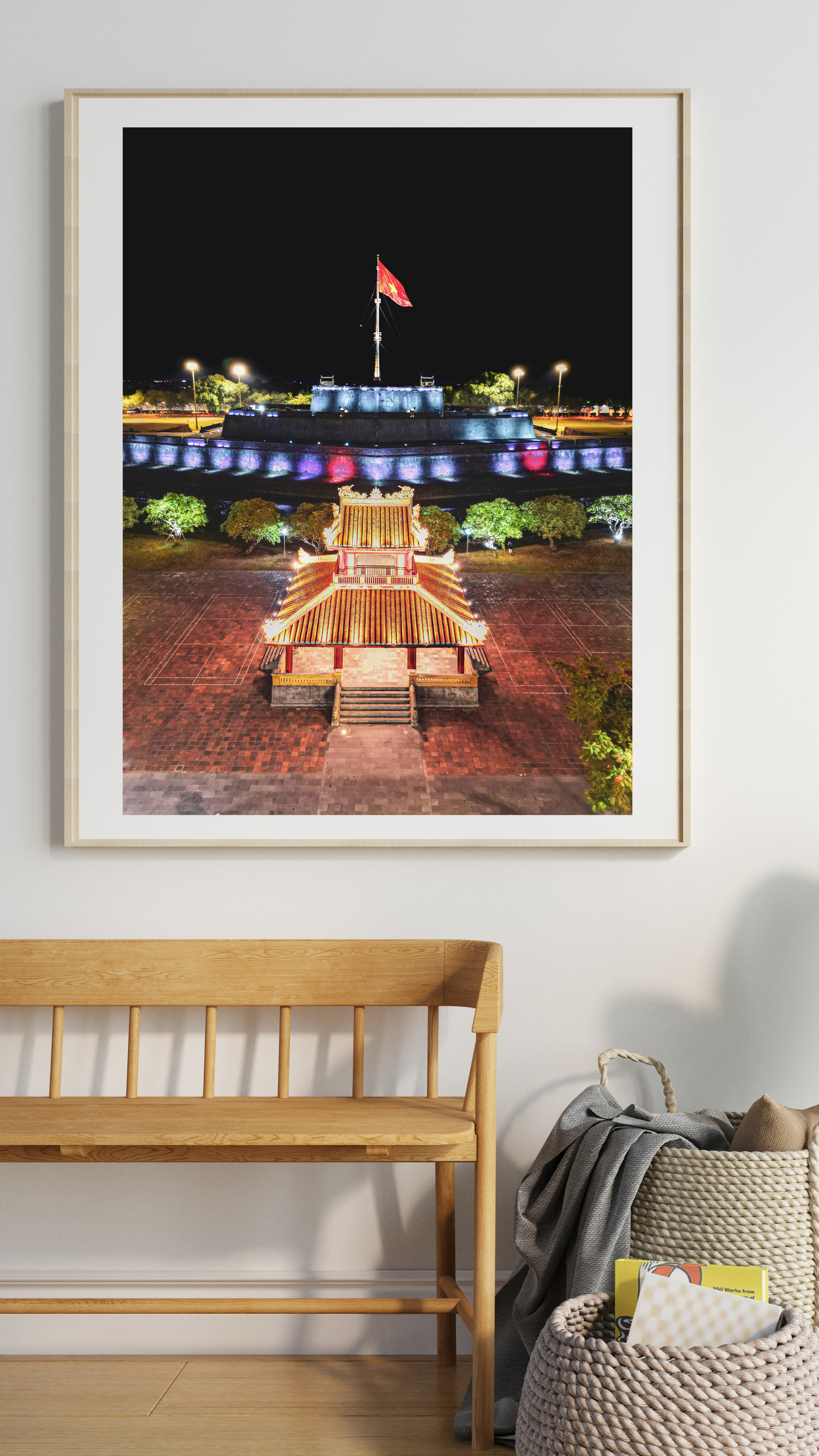 Experience the venerable glow of Hue's Imperial City by night through this vivid aerial photograph. The proud Vietnamese flag unfurls above, harmonizing with the temple's warm illumination—a beacon of heritage standing resolute against the night sky.