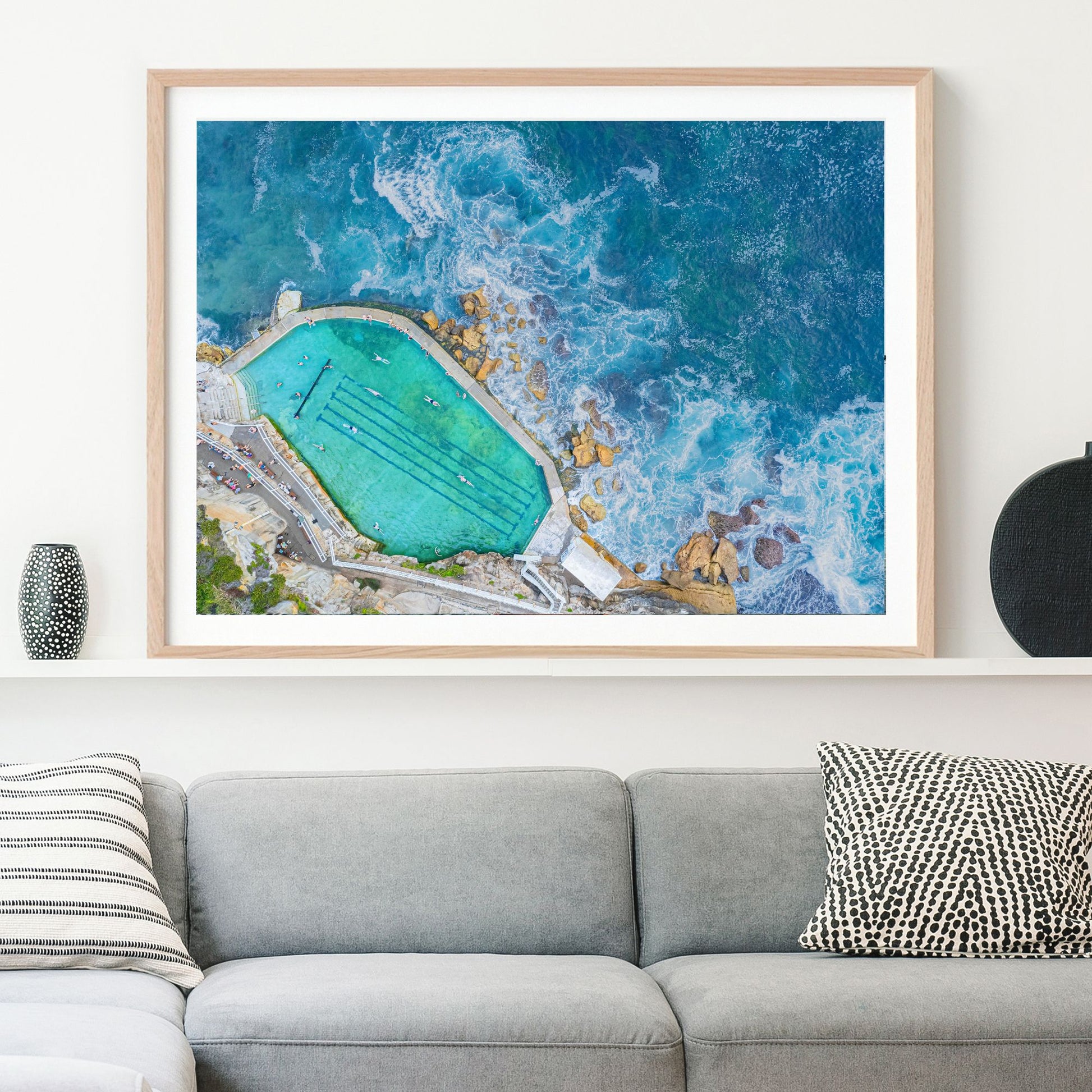 Step into the Bronte Baths breeze with 'The Ocean's Door'—our premier aerial photo art of Sydney's iconic rock pools.